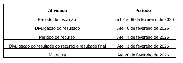 O processo seletivo para seleção de novos Alunos Especiais no PROFMAT do CEFET-MG no 1º semestre letivo de 2026 segue o seguinte cronograma: